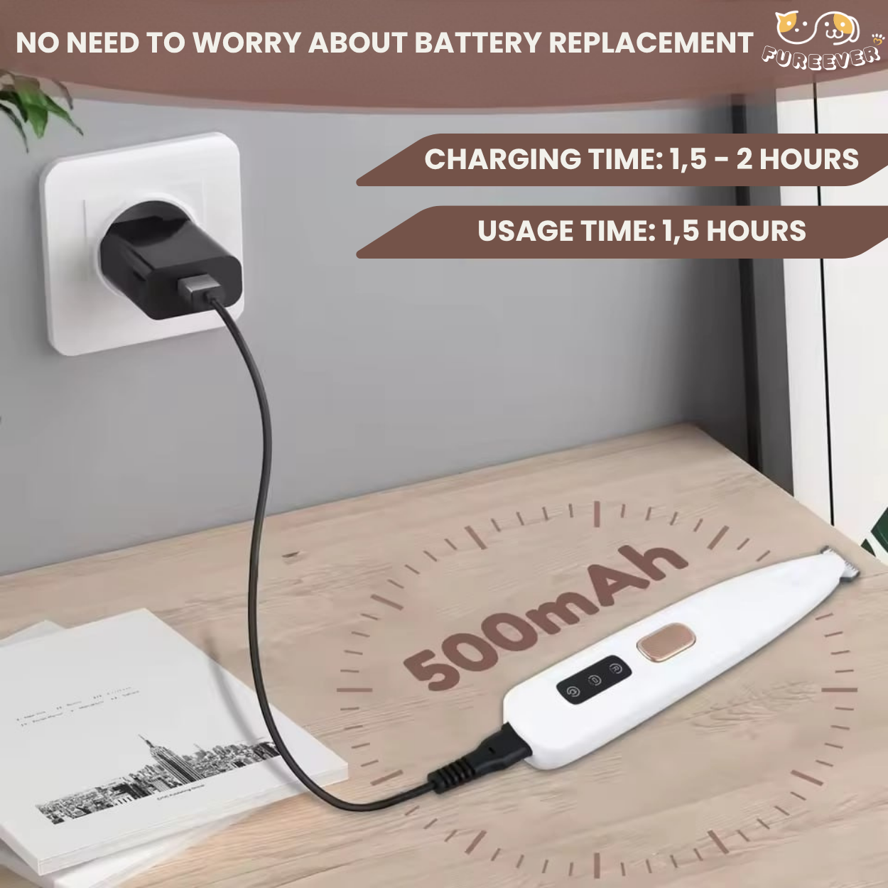 The FureEver™ Trimmer features a long-lasting rechargeable battery with up to 90 minutes of continuous use per full charge.